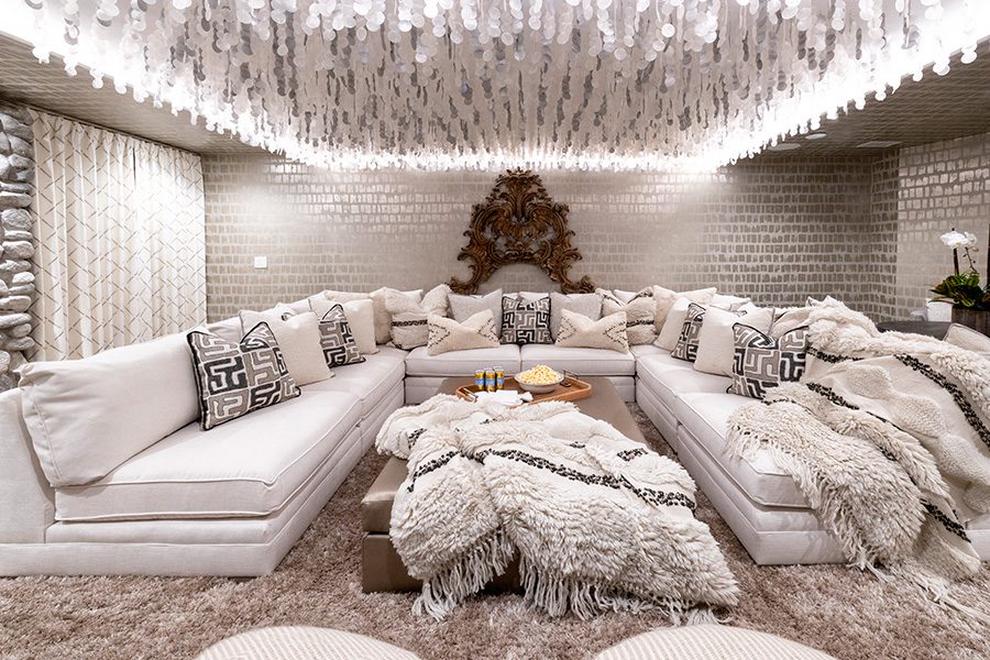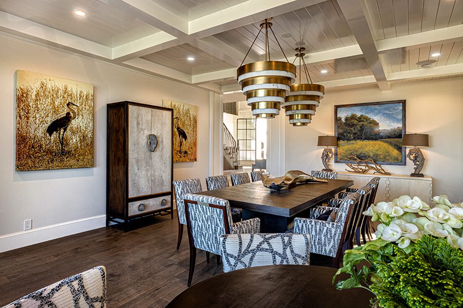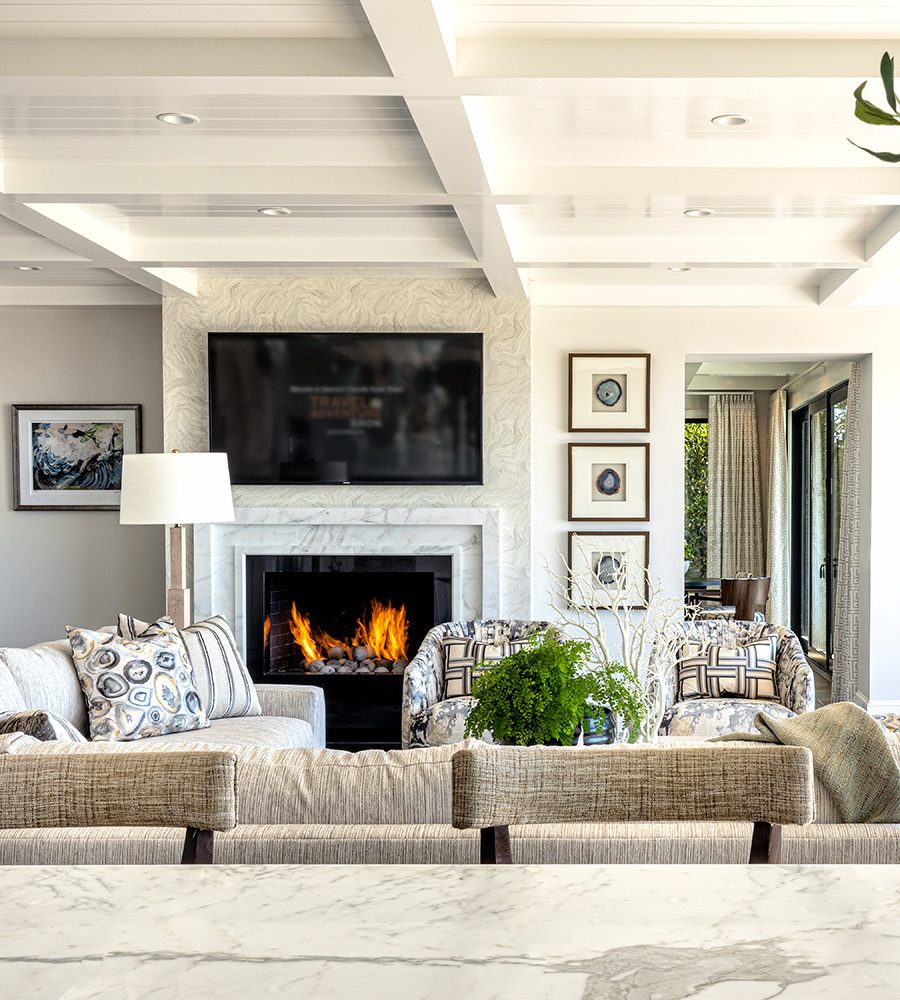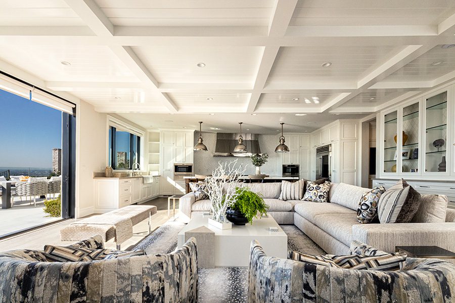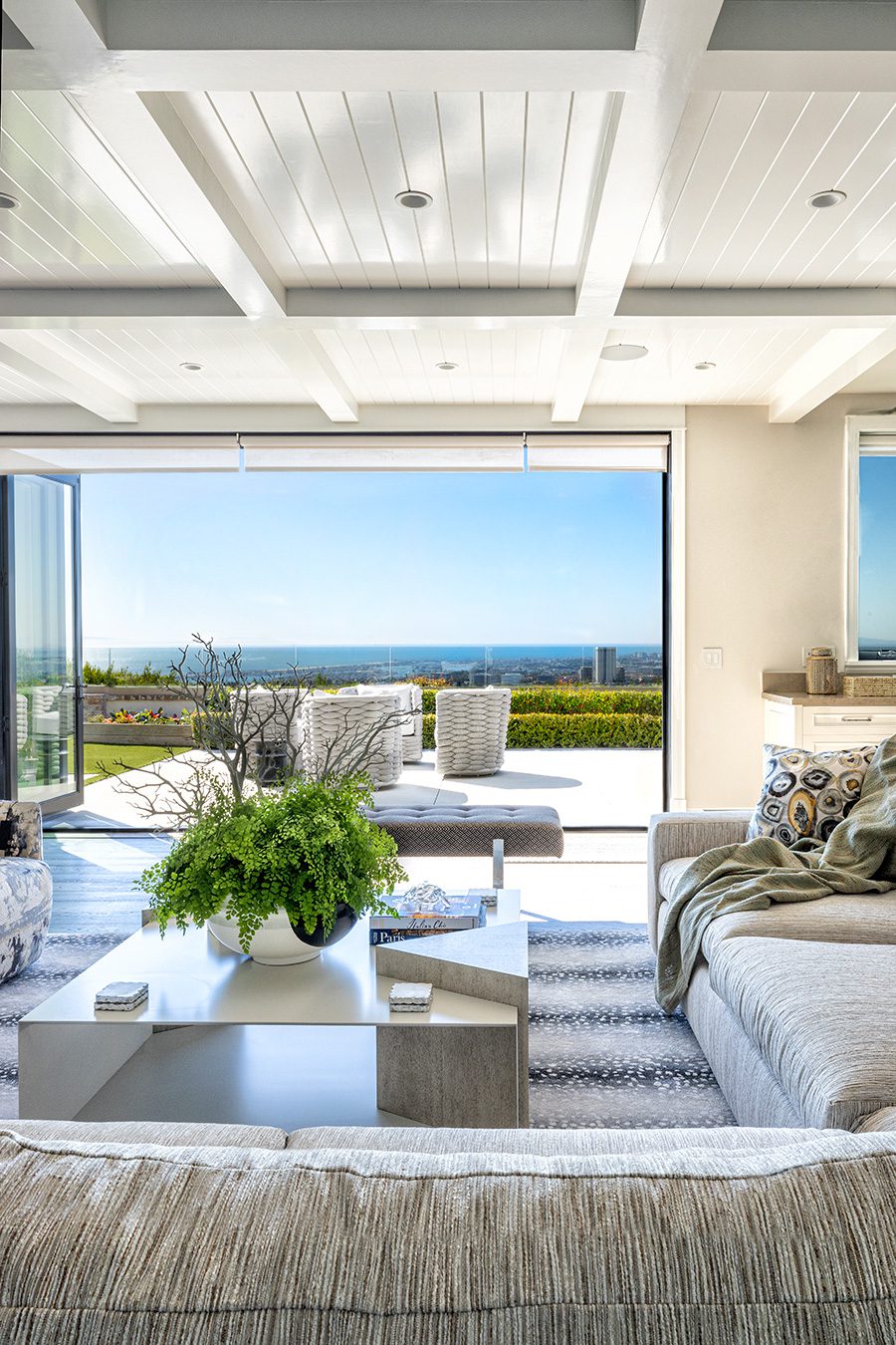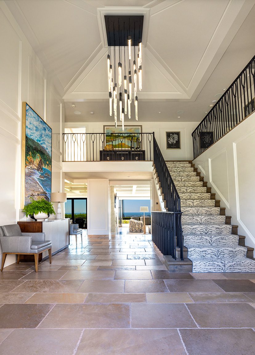 This coastal-inspired home merges timeless elegance with a relaxed, modern design, emphasizing seamless indoor-outdoor living and breathtaking ocean views. The grand foyer, adorned with a soaring ceiling and contemporary chandeliers, sets a luxurious yet inviting tone. In the living area, a coffered ceiling and plush, textured furnishings in a neutral palette create a sense of comfort, flowing into the outdoor terrace. The kitchen, with a marble island and custom cabinetry, balances functionality with style.