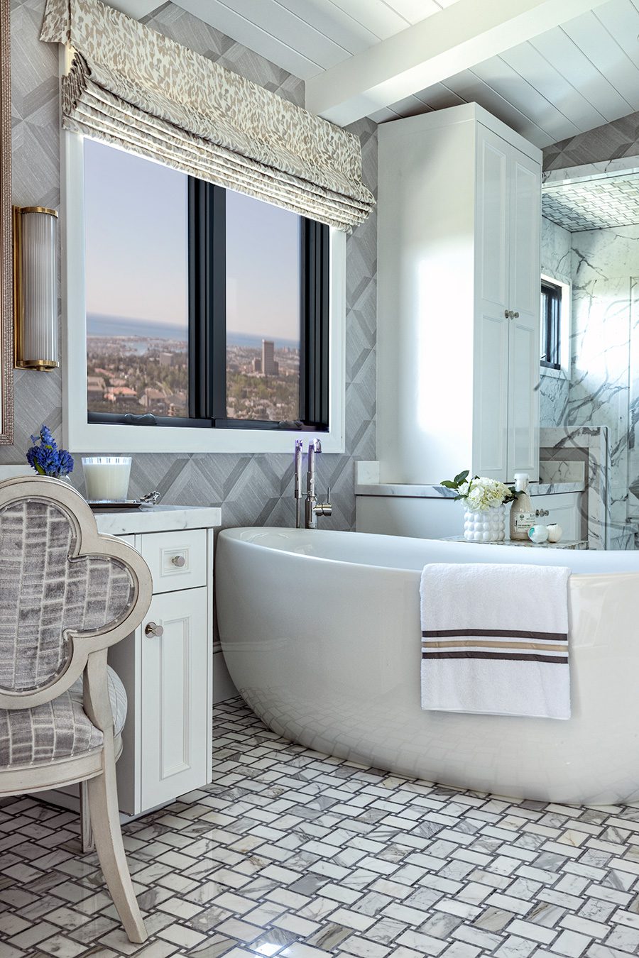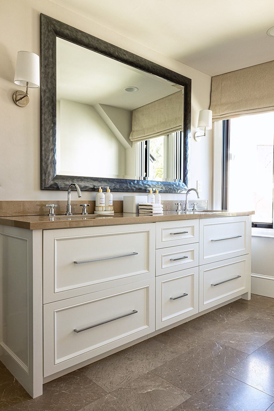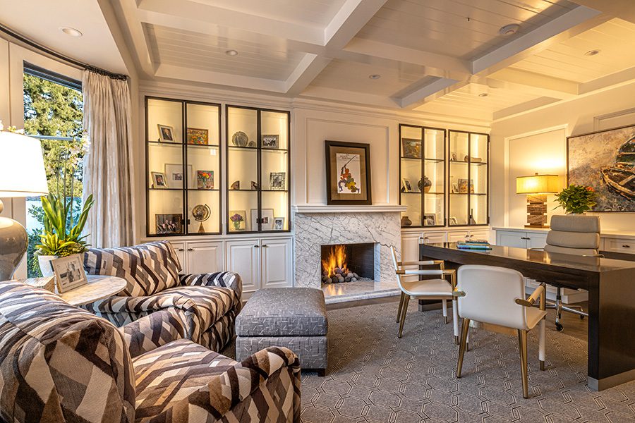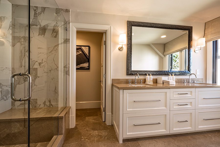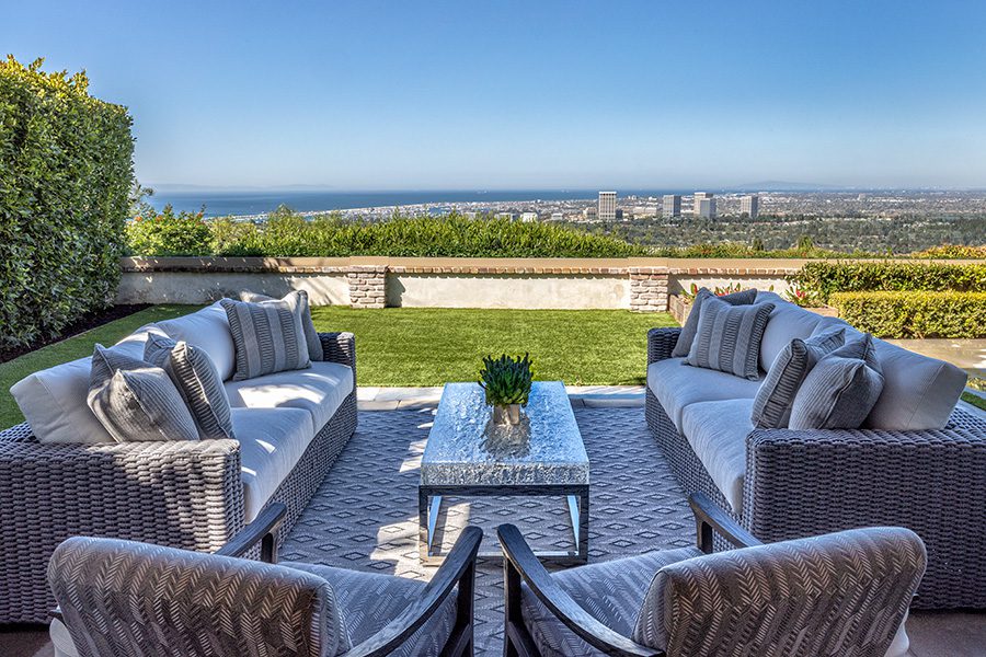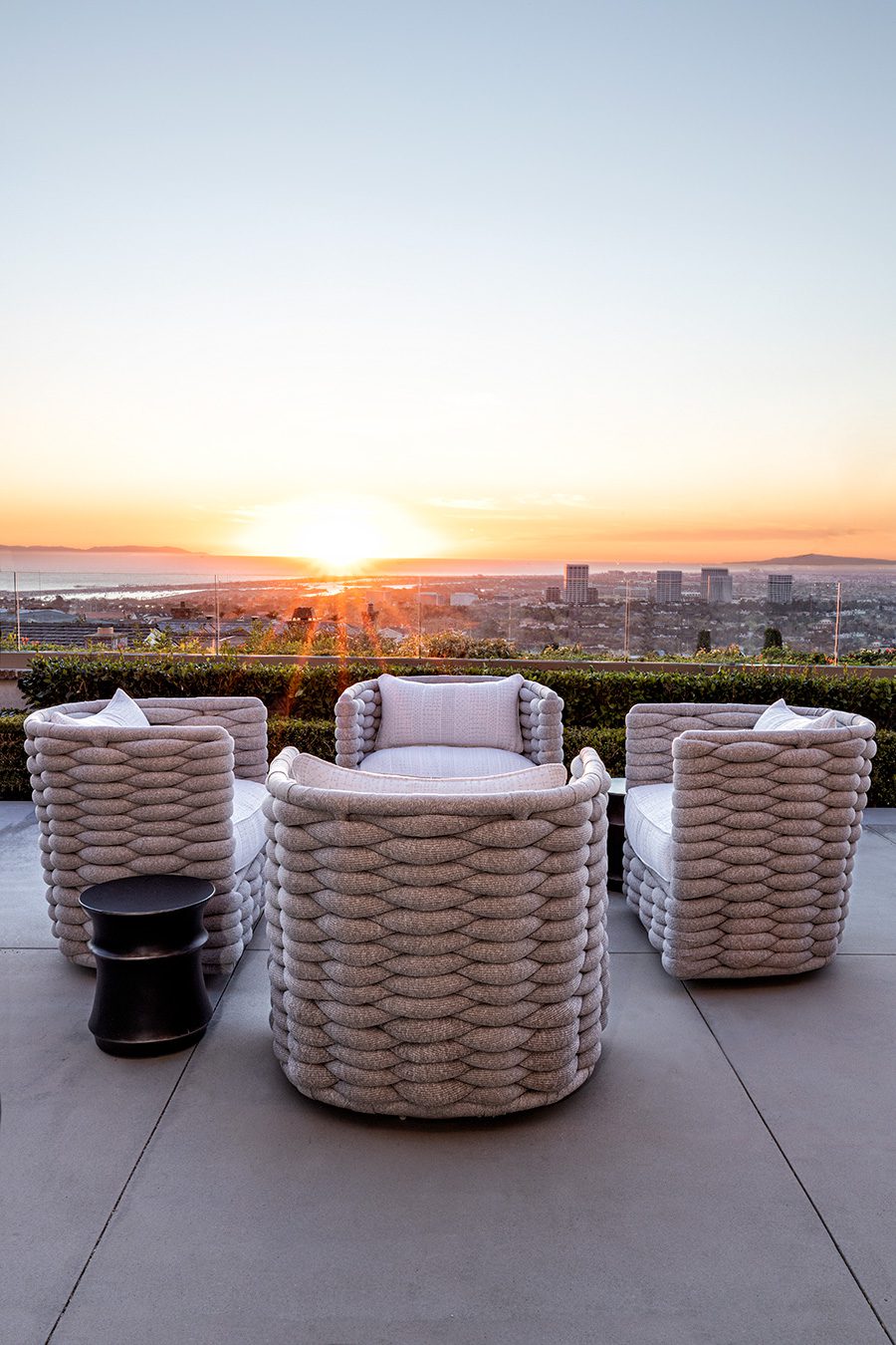 Each room is thoughtfully curated, from the serene, mural-adorned powder room to distinct “His” and “Hers” office spaces tailored for personalized luxury. The master suite is a tranquil retreat with custom bedding and a spa-like bath featuring marble and mosaic accents. Outside, a landscaped patio provides comfortable seating to enjoy panoramic sunset views, capturing the serene charm and sophistication of refined coastal living.